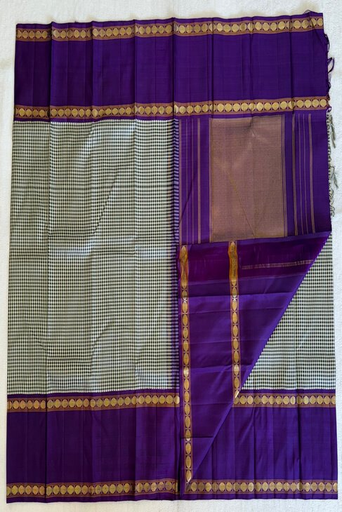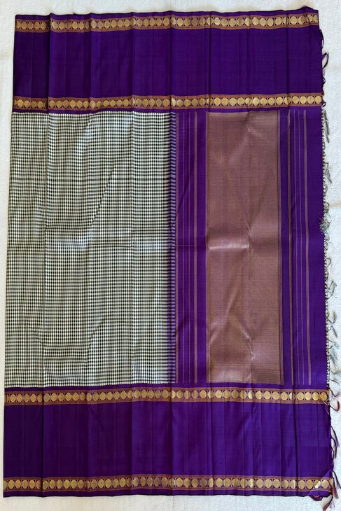 Yet another timeless classic, this black and white checked saree is beautifully accented with a deep purple Rudraksh split border, creating a striking balance of tradition and contrast.