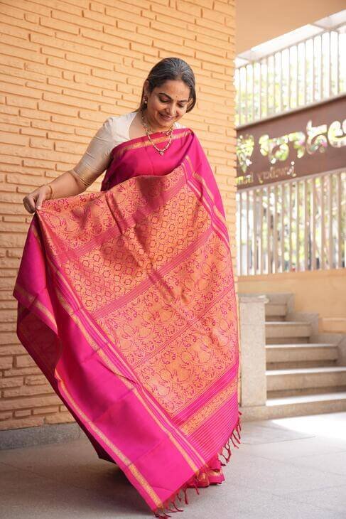 This Kanjeevaram saree treasures exquisite yet dainty zari wovens body and an exravagant double pallu with ganda berunda motifs