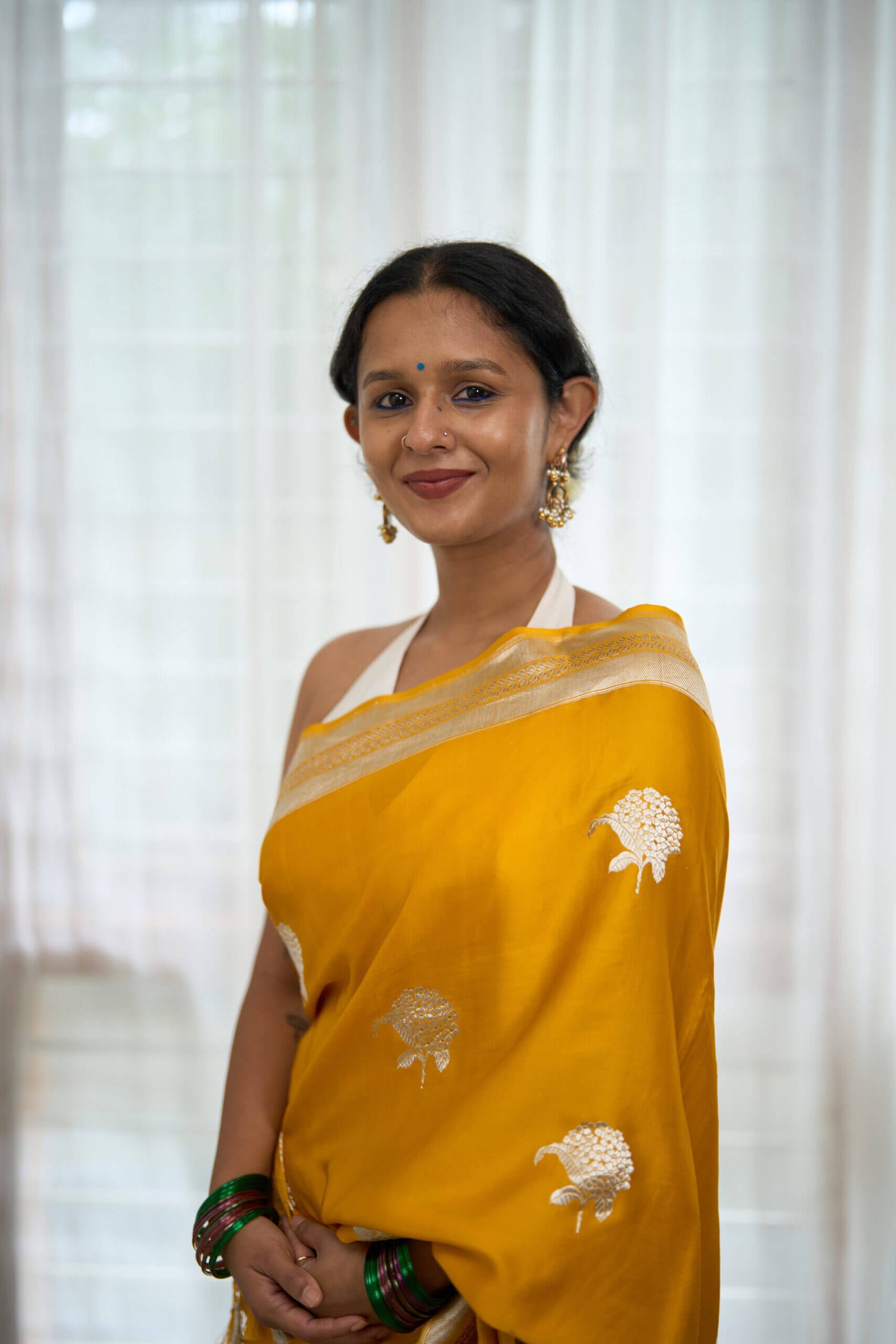 This yellow satin silk banarsi saree is lustrous and flowy and drapes like a dream. The unique motifs and the rich tape border adds and omph like no other.